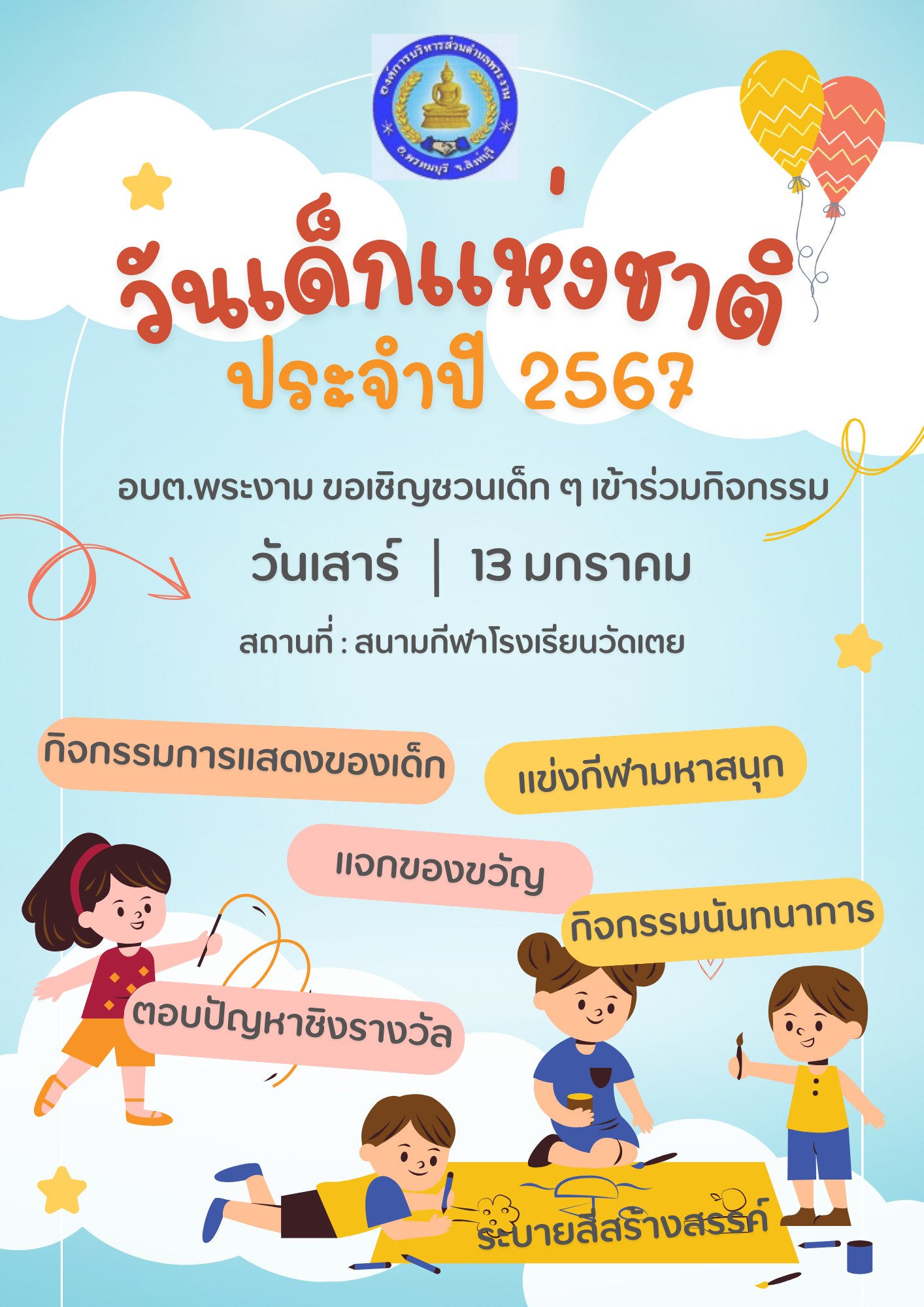 รายละเอียด : องค์การบริหารส่วนตำบลพระงาม ขอเชิญชวนน้อง ๆ เด็ก ๆ ในพื้นที่ตำบลพระงาม ร่วมกิจกรรมวันเด็กแห่งชาติ ประจำปี 2567 ในวันเสาร์ที่ 13 มกราคม 2567 ณ สนามกีฬาโรงเรียนวัดเตย